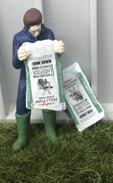 Contadino che svuota un sacco di cibo per capre