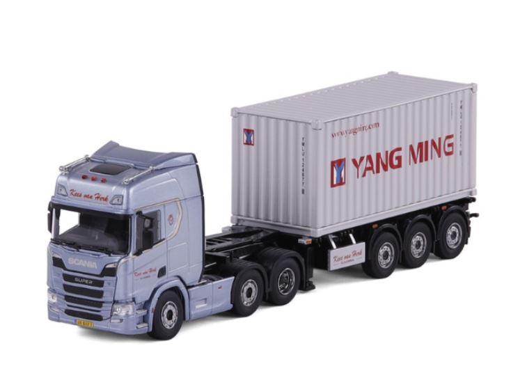 SCANIA R Highline 6x2 con autocarro portacontainer a 3 assi e container Yang-Ming KEES VAN HERK
